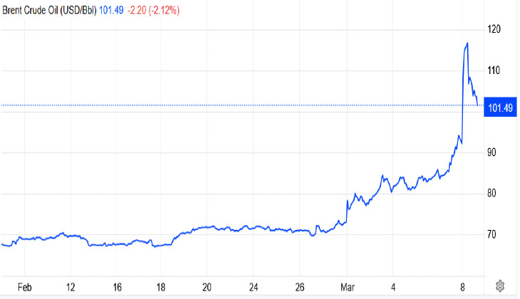 Prezzo del Brent nell'ultimo mese (aggiornato al 9/3/26)