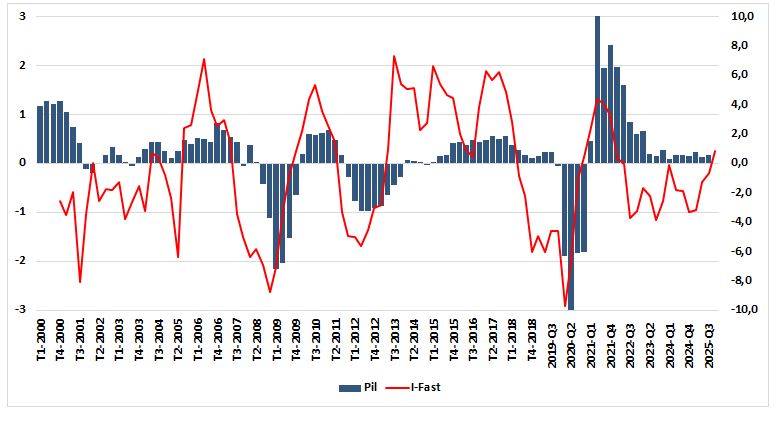 Eppure, una ragione algebrica per un moderato ottimismo ci sarebbe. E’ l’indicatore congiunturale del Centro Einaudi (I-Fast), costruito con 9 indici mensili tempestivamente disponibili. Sopra lo zero indica espansione, e sotto lo zero recessione. Come si vede, l’indicatore ha bucato l’asse e vale 0,24. E’ un numero piccolo, per quanto in crescita da alcuni mesi. In passato, quando ha passato l’asse orizzontale, la crescita è arrivata davvero. Non resta che augurare e augurarci un buon 2026!