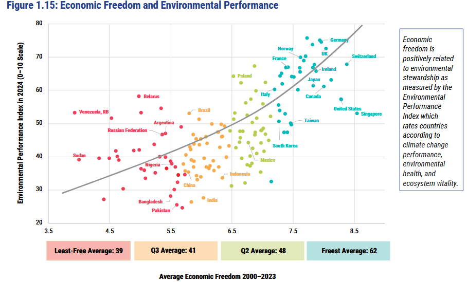 La libertà economica è infatti positivamente correlata alla tutela dell’ambiente, come misurato dall'Environmental Performance Index (EPI), che valuta i Paesi in base alla performance sul cambiamento climatico, alla salute ambientale e alla vitalità degli ecosistemi. L’EPI misura e classifica le performance ambientali di 180 Paesi, fornendo una valutazione comparativa su quanto ciascuno stia progredendo verso obiettivi di sostenibilità. Vengono utilizzati 58 indicatori raggruppati in 11 categorie tematiche, che a loro volta si collegano a tre grandi obiettivi di policy: