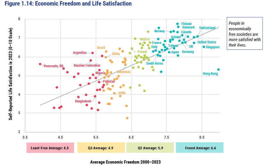 costoro godono infatti di maggiore prosperità, di più ampie libertà politiche e civili e di una aspettativa di vita più lunga. Per esempio, il PIL pro capite nei Paesi appartenenti al 25% con il più alto livello di libertà economica è stato di 66.434 dollari USA nel 2023, rispetto a 10.751 dollari USA per il quartile di Paesi con la minore libertà economica. Anche i tassi di povertà risultano inferiori. Nel quartile più libero economicamente, solo il 2% della popolazione ha sperimentato povertà estrema (vivendo con meno di 3,65 dollari USA al giorno), rispetto al 52% nel quartile meno libero.