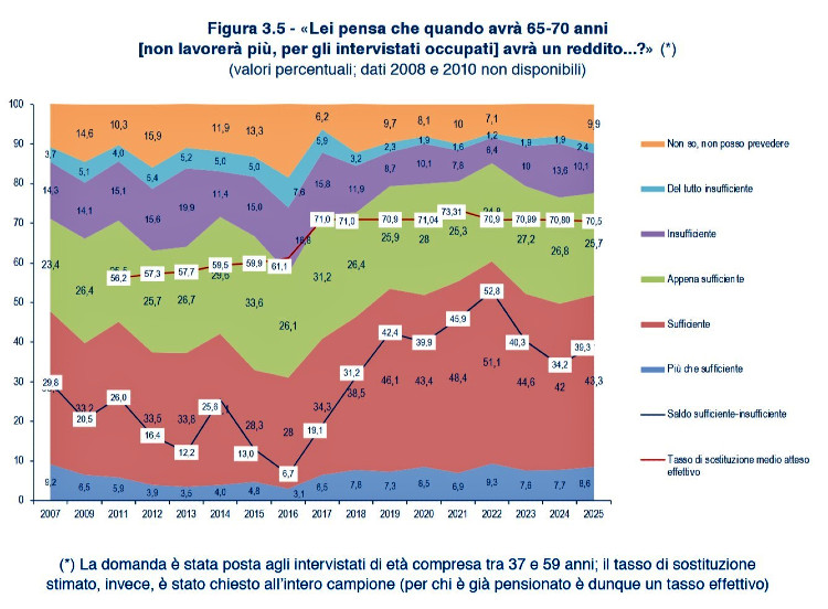 Quello che a prima vista sembrava un miglioramento delle aspettative si rivela piuttosto una crescente consapevolezza del funzionamento del sistema – in particolare del metodo contributivo – più che un effettivo rafforzamento delle prospettive previdenziali. Si tratta di un elemento che segnala un processo di adattamento delle aspettative individuali ai vincoli esistenti, piuttosto che una reale messa in sicurezza del futuro pensionistico. Basti pensare che l’importo medio annuo delle pensioni di vecchiaia/anzianità e di reversibilità è di circa 14.000 euro e che oltre il 57 per cento dei pensionati percepisce pensioni inferiori ai 1.000 euro mensili.