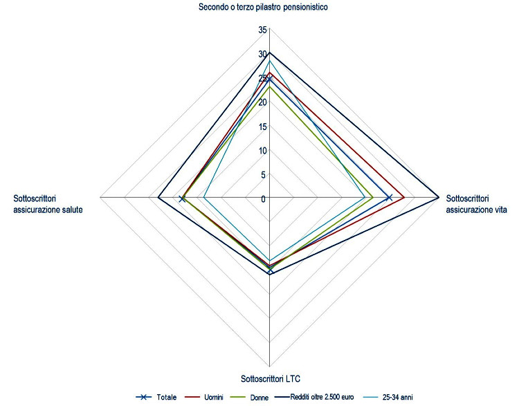 Questi dati diventano ancora più rilevanti se si considerano due grandi tendenze strutturali come l’invecchiamento della popolazione e la riduzione delle dimensioni dei nuclei familiari. Gli strumenti di copertura di lungo termine infatti non sembrano aver trovato una diffusione soddisfacente né tra le persone anziane (che sempre più spesso affrontano situazioni di fragilità con un supporto familiare ridotto), né tra quelle più giovani, che pure disporrebbero di un orizzonte temporale più lungo. Il fenomeno si spiega senza dubbio soprattutto attraverso la lettura dei vincoli di reddito, ma il fatto che la diffusione resti bassa anche tra i redditi più elevati suggerisce l’esistenza di problemi più profondi e legati alla struttura dell’offerta, che viene probabilmente percepita come poco aderente ai bisogni reali.