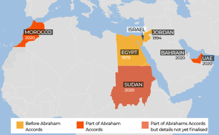 Gli Accordi di Abramo sono una serie di intese bilaterali tra Israele ed alcuni stati arabi: in primis Emirati, poi Bahrein, Sudan, Marocco. Siglati in rapida successione nell’arco del 2020, sono stati progettati dalla prima amministrazione Trump e sostenuti poi anche da quella Biden. Anche nell’America polarizzata di questi tempi rappresentano quindi un progetto che risponde agli interessi statunitensi al di là del colore politico dell’amministrazione di turno. Gli Accordi comportano il riconoscimento diplomatico e la normalizzazione dei rapporti (politici, economici, culturali, etc.) tra Israele e gli stati menzionati. L’intento dichiarato è quello di porre fine al conflitto arabo-israeliano, in tal modo risolvendo anche il problema palestinese. Dopo la pace tra Israele ed Egitto del 1979 e quella tra Israele e Giordania del 1994, infatti, non vi erano stati paesi arabi che avessero riconosciuto ufficialmente lo stato ebraico.