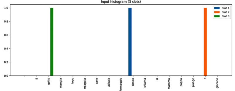 Nella figura precedente si vede l’istogramma dei valori di input, attivi per le parole “bimbo”, “e”, “gatto”; nella seguente quello dei valori di output, attivi per “giocano” e per una posizione senza significato, uno “spazio vuoto”, dato che l’output può essere composto di uno o due termini e in questo caso ne abbiamo uno solo.