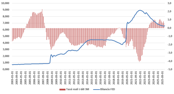 Attivi della Fed, in trilioni di dollari (scala sx) e tasso reale di interesse: US t-bill trimestrali - inflazione core (scala dx) - 2003-2025
