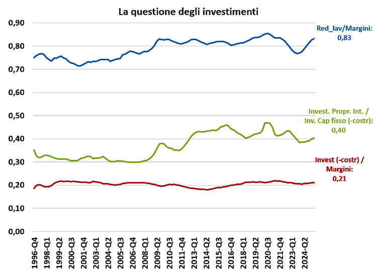 Sul fronte del finanziamento interno, il secondo grafico offre un'analisi illuminante. Il rapporto tra redditività del lavoro e margini operativi lordi (Red_lav/Margini) si è mantenuto stabile tra 0,72 e 0,85 nel periodo considerato, attestandosi a 0,83 nel 2024. Questa stabilità indica che la distribuzione funzionale del reddito tra salari e profitti è rimasta sostanzialmente costante, contrariamente alla narrazione di un'eccessiva compressione salariale a favore dei profitti. L'aumento delle disuguaglianze patrimoniali, documentato dall'evoluzione dell'indice di Gini sulla ricchezza finanziaria, ha avuto quindi origine principalmente dall'accumulo di rendite piuttosto che di profitti d'impresa: titoli di Stato con rendimenti garantiti, rivalutazioni azionarie indotte dalle politiche monetarie ultra-espansive, apprezzamento degli asset immobiliari.