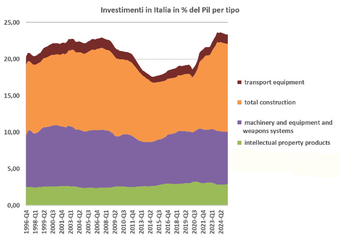 ISTAT, Conti economici nazionali, serie storica investimenti fissi lordi per tipo di bene, 1995-2024.