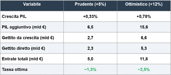 Le simulazioni macroeconomiche, condotte usando una funzione di produzione standard con i dati italiani (PIL di 2.000 miliardi, pressione fiscale del 42%, 2,5 milioni di lavoratori immigrati), traducono i parametri in cifre.