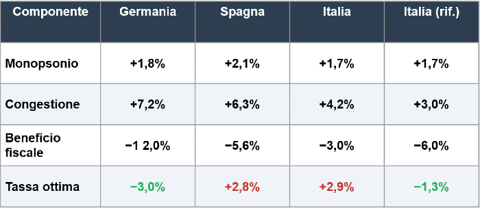 Abbiamo calibrato il modello su Germania, Spagna e Italia, con uno scenario aggiuntivo per l’Italia dopo ipotetiche riforme strutturali. I parametri riflettono condizioni reali: l’elevato contributo fiscale degli immigrati in Germania (dove il tasso di occupazione degli stranieri è tra i più alti d’Europa), la segmentazione del mercato del lavoro spagnolo, e il caso italiano con la sua combinazione di informalità, bassi salari degli immigrati e frizioni istituzionali. La tabella riassume la decomposizione della tassa ottima.